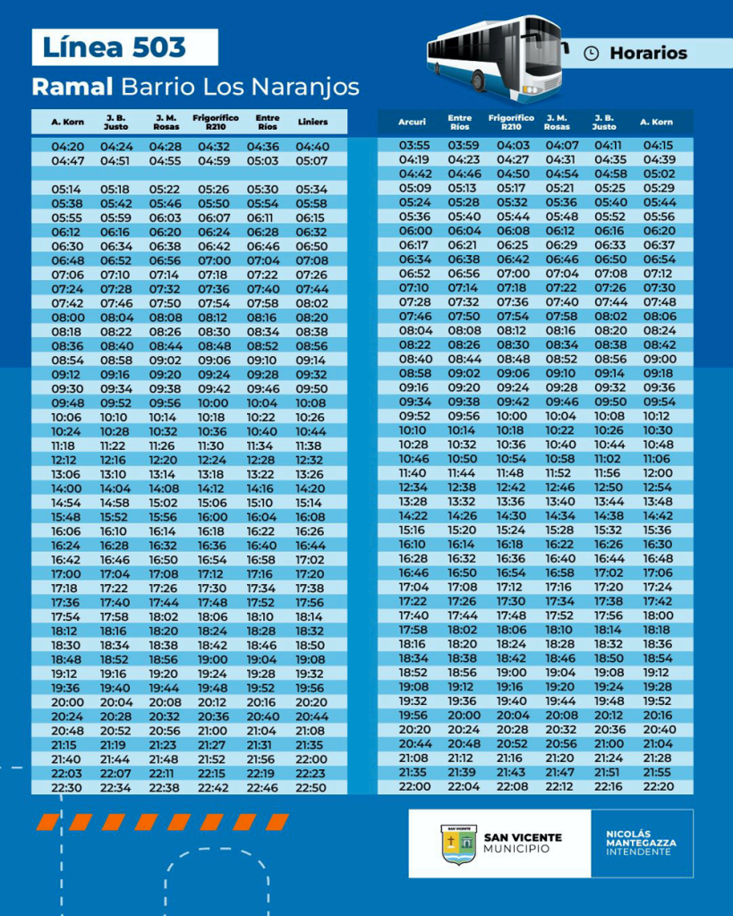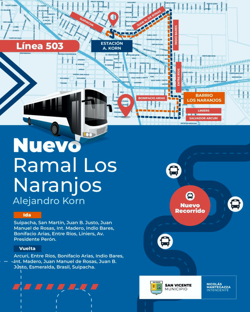 Alejandro Korn | La línea de colectivos 503, perteneciente a la Empresa San Vicente SAT inauguró ayer un nuevo ramal entre la estación férrea de Alejandro Korn y la calle Salvador Arcuri, en el barrio Los Naranjos, pasando también por los barrios, Santa Ana, Versailles y Matadero. El primer servicio desde la estación es a las 4.20 y el último desde Los Naranjos parte a las 22.