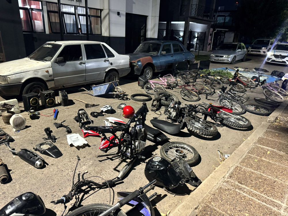 Vehículos y Autopartes: Motocicleta Corven Triax, color blanco y rojo, cuadro N° 8CVJCKL08RA084162, con pedido de secuestro por robo del 28/01/2026. Siete bicicletas, rodados 29 y 26, recuperadas en el Objetivo 1. Cuadro de motocicleta sin marca y con la numeración suprimida. Motor Peugeot 308, block de motor con numeración suprimida. Butacas Peugeot 308, juego de asientos y diversas autopartes adicionales. Carretilla color azul. Carrito de carga, con óxido negro y dos ruedas de goma.