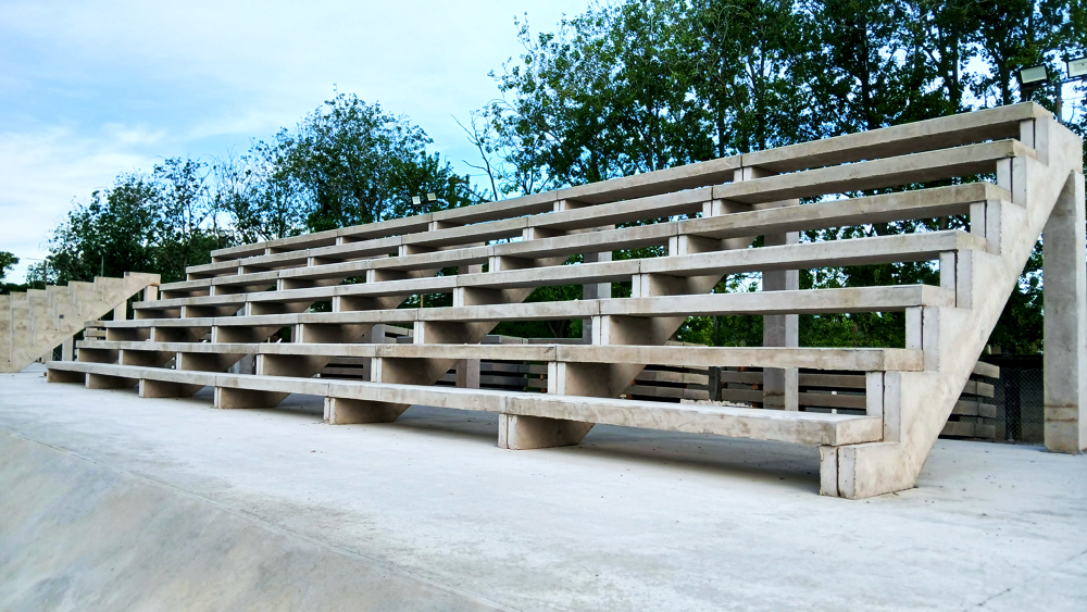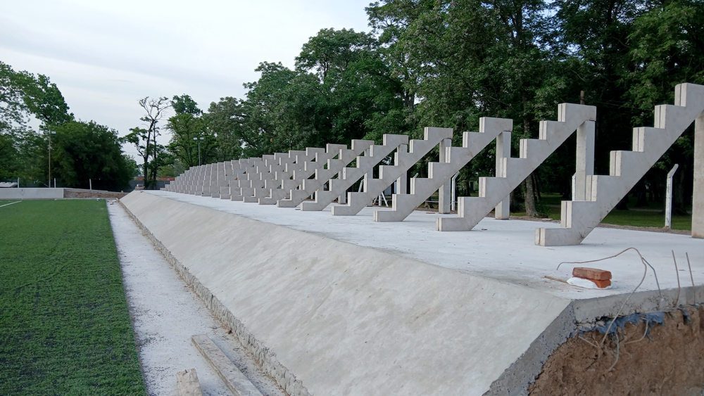 En las últimas dos semanas, la empresa encargada de la obra, comenzó con la construcción de las tribunas. Las mismas son de hormigón pre armado y ocuparán gran parte del perímetro del campo de juego, dándole al estadio una capacidad superior a las 8.000 personas. Luego que se finalice con el levantamiento de las gradas, se colocará el alambrado perimetral para separar éstas del campo de juego. Tendrá 4 metros de altura.