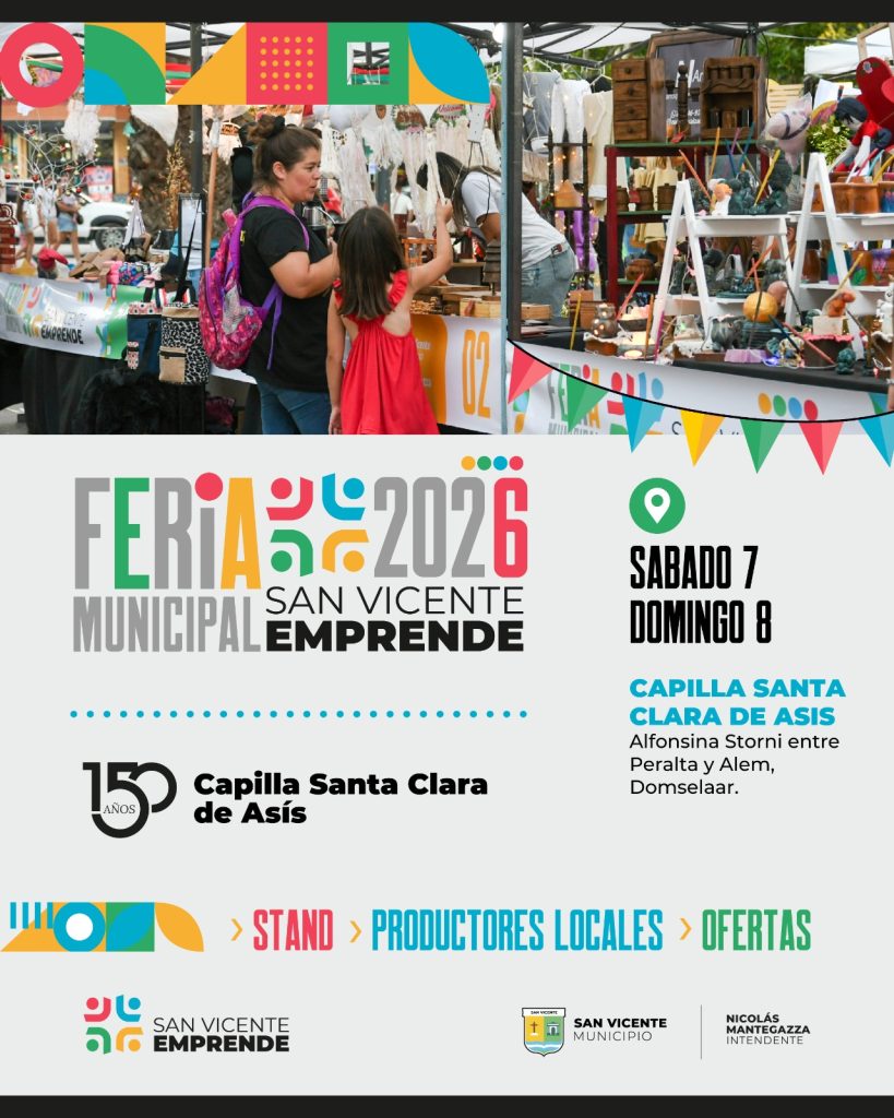 Domselaar | La localidad de Domselaar se prepara para un fin de semana especial con la llegada de la Feria de San Vicente Emprende 2026. El evento, que reúne lo mejor del talento local, se llevará a cabo los días sábado 7 y domingo 8 de febrero. Esta edición tiene un tinte histórico y emotivo, ya que se desarrolla bajo el marco de los festejos por los 150 años de la Capilla Santa Clara de Asís, un pilar fundamental de la identidad domselaarense.