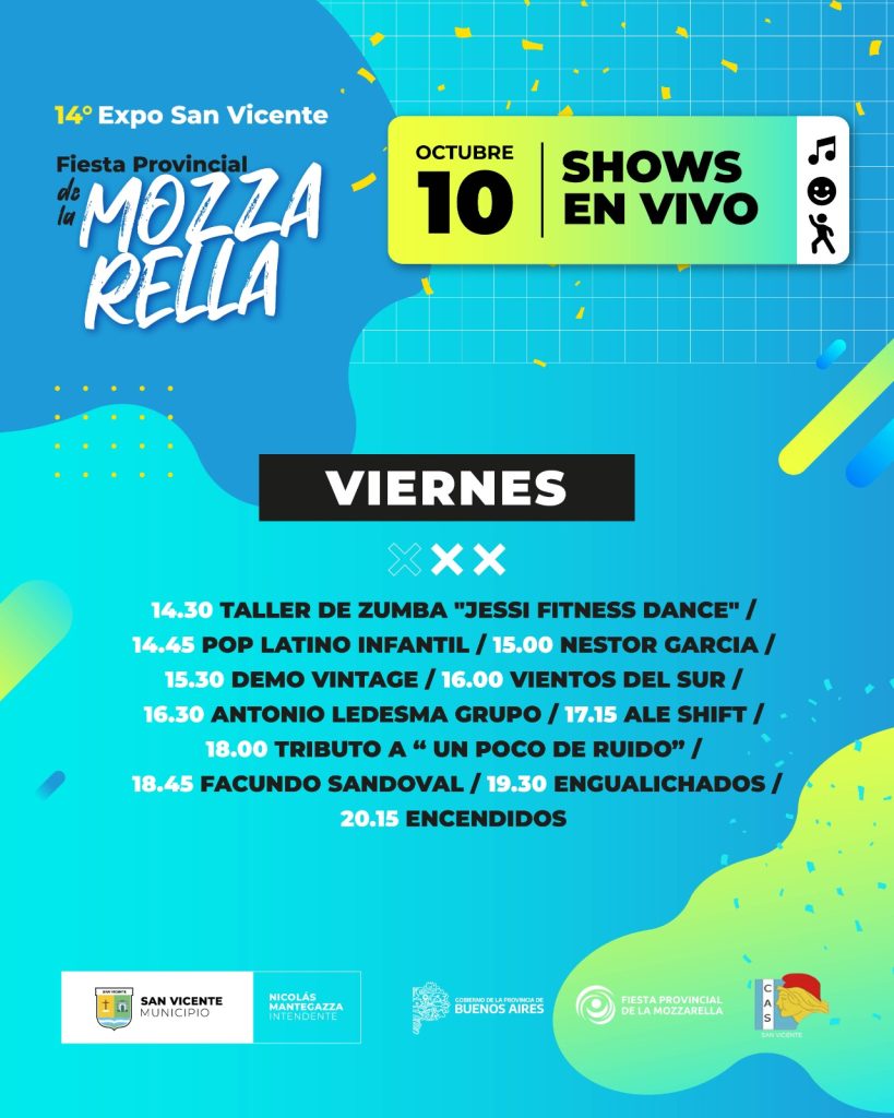 El viernes 10 abrirá con clases y demostraciones de baile, como el taller de zumba “Jessi Fitness Dance” y el grupo Pop Latino Infantil. Más tarde, subirán al escenario Néstor García, Demo Vintage, Vientos del Sur, Antonio Ledesma Grupo y Ale Shift, cerrando la jornada con Facundo Sandoval, Engualichados y Encendidos.