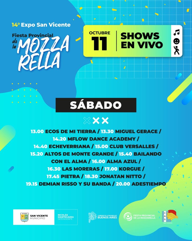 El sábado 11 ofrecerá una programación diversa con la participación de Ecos de mi Tierra, Miguel Gerace, Flow Dance Academy, Altos de Monte Grande, Alma Azul, Las Moreras, Korgue, Pietra, Jonatan Nitto, Demian Risso y su banda, y el cierre musical de Adestiempo.