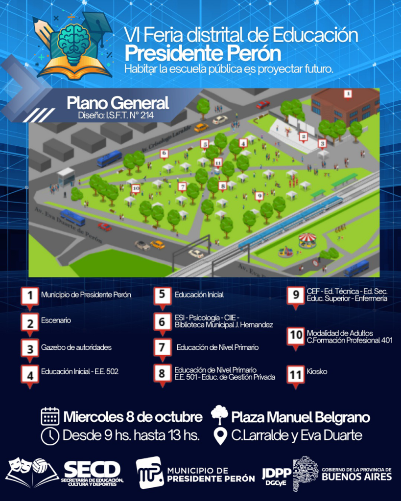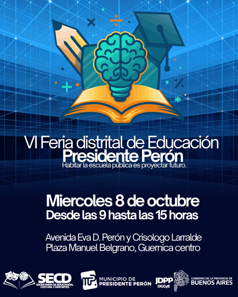 Guernica | Con la organización del Municipio de Presidente Perón, a través de su Secretaría de Educación, Cultura y Deportes, este miércoles 8 de octubre –desde las 9 de la mañana- se llevará a cabo en la Plaza Manuel Belgrano (avenida Eva Perón y Crisólogo Larralde, Guernica), la sexta edición de la Feria Distrital Educativa de Presidente Perón.