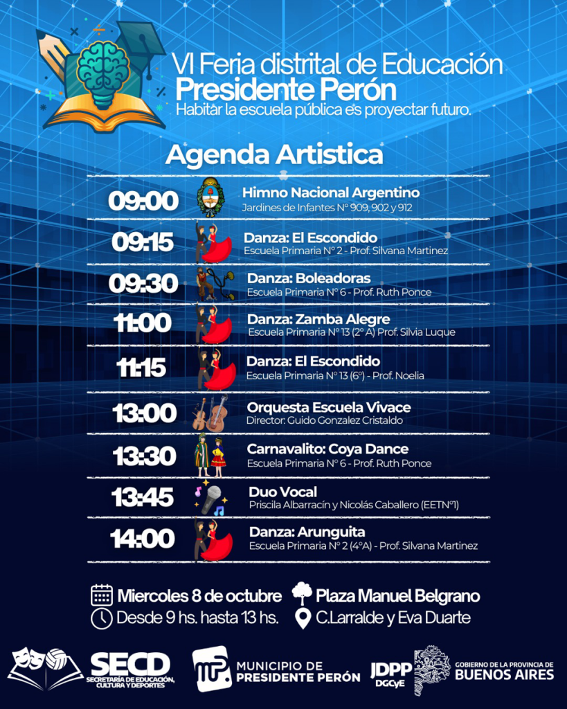 Además habrá una grilla de propuestas artísticas de los estudiantes de las escuelas, con la presencia especial de la Orquesta Escuela «Vivace» de Presidente Perón. El evento se extenderá hasta las 15 horas.