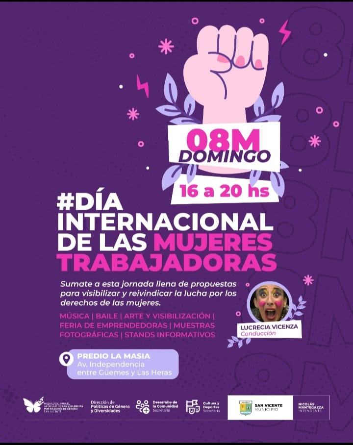 San Vicente | Bajo el lema de visibilizar y reivindicar la lucha por los derechos de las mujeres, el Municipio de San Vicente llevará adelante este domingo 8 de marzo una jornada integral en el Predio La Masía (avenida Independencia entre Güemes y Las Heras). De 16 a 20 horas, el evento contará con la conducción de Lucrecia Vicenza y ofrecerá una variada agenda que incluye música en vivo, muestras fotográficas, stands informativos y una feria de emprendedoras locales, consolidando un espacio de encuentro comunitario y reflexión en torno al 8M.