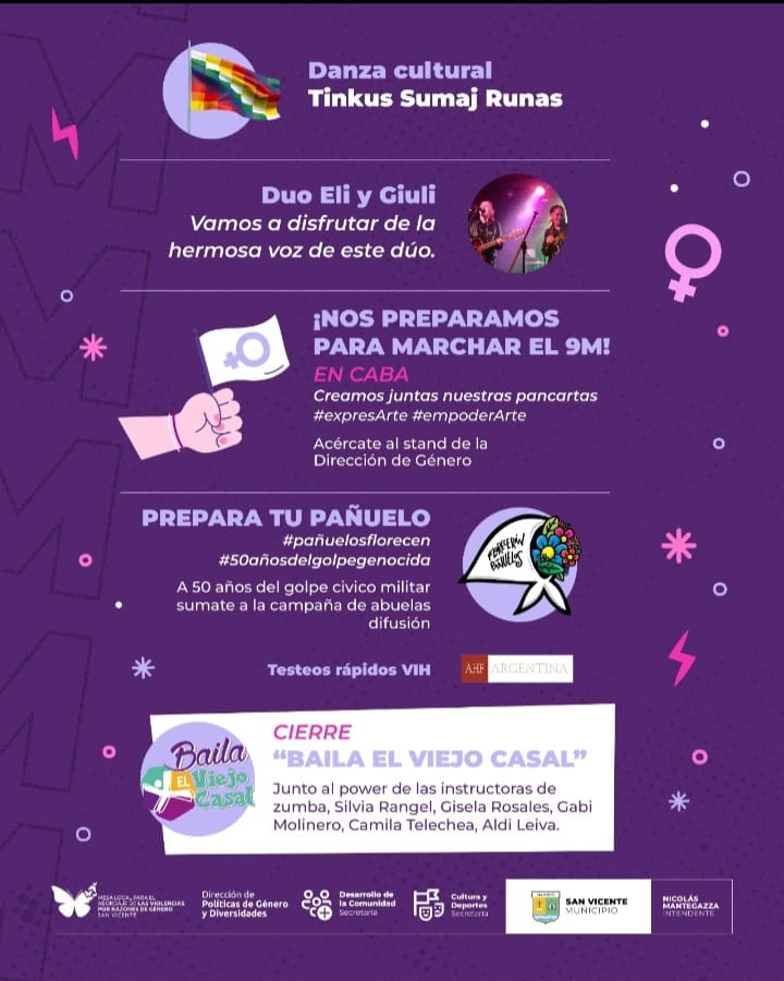 En paralelo, la Secretaría de Salud y AHF Argentina dispondrán de una unidad para testeos rápidos de VIH, mientras que la campaña “Prepara tu pañuelo” se sumará a las acciones de Abuelas de Plaza de Mayo bajo las consignas #pañuelosflorecen y #50añosdelgolpegenocida, vinculando la agenda feminista con la memoria histórica.