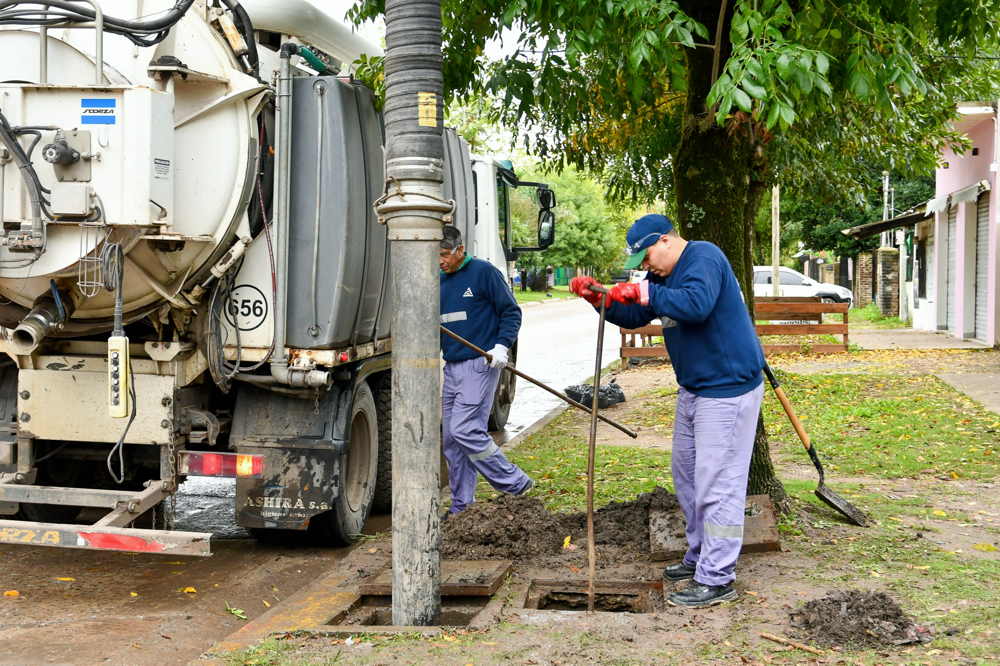 El esquema de saneamiento hidráulico también sumó puntos de trabajo específicos, como en la intersección de las calles Arcuri y Don Quijote en Alejandro Korn. Allí, cuadrillas municipales desarrollaron tareas de limpieza y desobstrucción de desagües para asegurar el correcto funcionamiento del sistema de drenaje local.