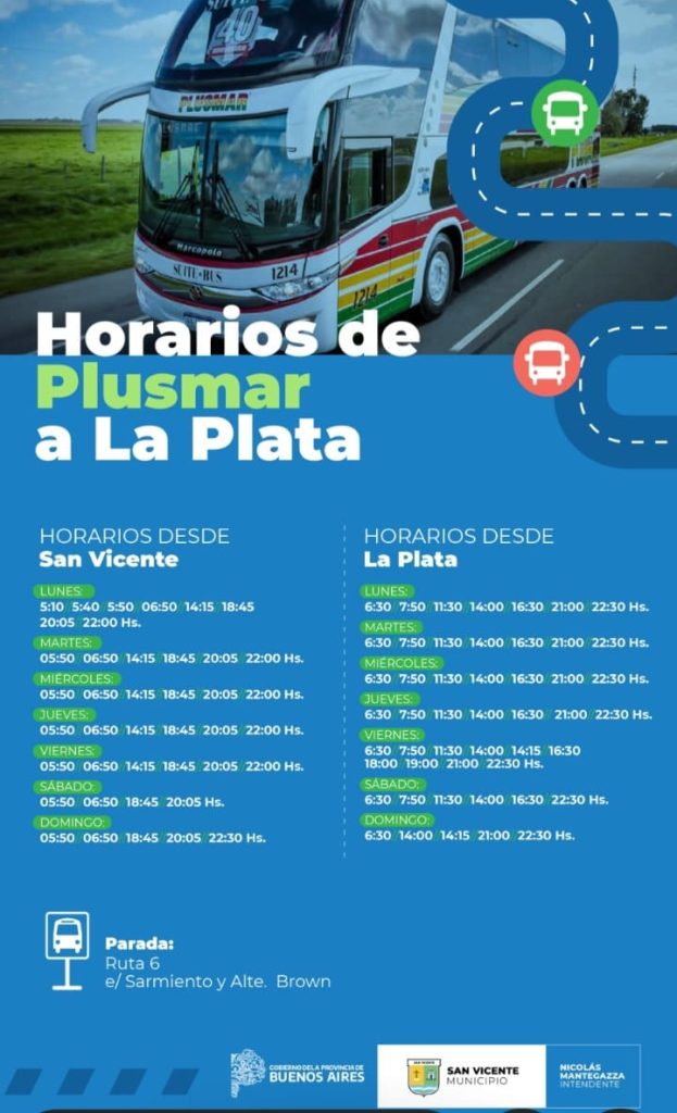 Todos los horarios del servicio Plusmar entre San Vicente y La Plata, con salida desde San Vicente desde Ruta 6 entre Sarmiento y Almirante Brown.