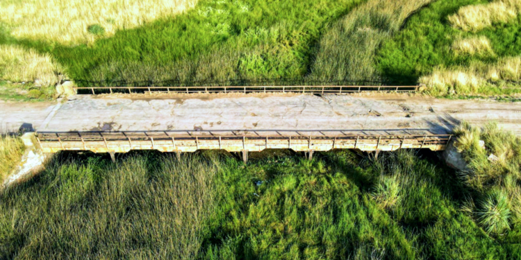El deteriorado puente se encuentra a 4,2 kilómetros de la Ruta Provincial 6 y pasa por encima del Arroyo Samborombón.